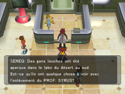 Il vous ramènera à l'accueil pour vous parler d'un Laboratoire Mystérieux situé en plein désert. Il avait servi à la création de Pokémon Obscurs cinq ans auparavant, mais il semble que des gens louches y aient été aperçus à nouveau ces temps-ci. Voici donc votre prochaine étape !