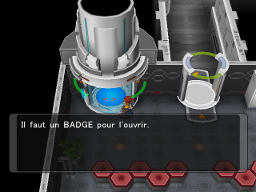 Prenez l'ascenseur. À la sortie, la porte d'en face est bloquée. Sur la gauche, le chemin donne sur une autre porte verrouillée et un dresseur.