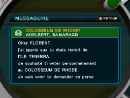 Vous reprenez le jeu au Laboratoire Pokémon. Très vite, vous recevez un mail d'Adelbert qui vous invite à le rejoindre au Colosseum de Rhode.