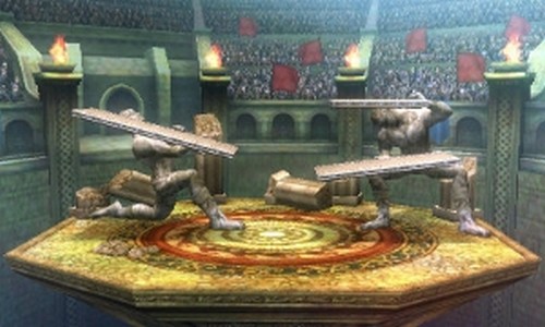 | Au début du combat, le terrain se compose d'une plateforme vide. Au fur et à mesure du combat, des obstacles et des plateformes secondaires apparaissent. Chaque variation apparaît de manière aléatoire. | |
