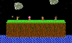 | Le niveau peut changer d'apparence à chaque fois qu'il est lancé. Ce terrain a comme particularité de permettre aux joueurs de traverser le côté gauche de l'écran pour se retrouver du côté droit et vice versa. Cependant, si un adversaire vous frappe violemment et vous fait traverser une des parties de l'écran, vous serez éliminé au lieu de simplement traverser. Des étoiles peuvent tomber du ciel et vous blesser. Si vous êtes trop près de l'eau, un poisson peut vous attraper, vous entrainer vers le fond de l'eau et ainsi vous éliminer. | |