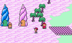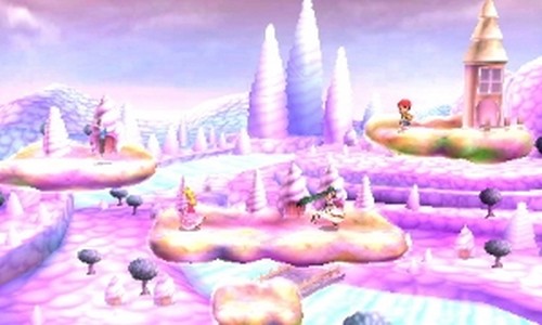 | Le terrain se compose de trois plateformes principales. Occasionnellement, des pousses apparaissent et peuvent servir de plateforme. Il arrive également que le ciel laisse apparaître des scènes du jeu original, n'affectant en rien le combat. Un Homme volant peut parfois apparaître dans une des maisons. Il aidera temporairement le joueur qui le battra. | |