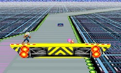 | Le terrain est composé de deux plateformes qui surplombent une course de F-Zero, en suivant la progression du Blue Falcon. Si vous tombez sur la piste, vous serez projeté vers le haut. | |