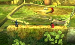 | Le terrain se compose de deux plateformes solides et une petite plateforme composée de lianes. Il arrivera qu'une pluie battante frappe le terrain et fasse s'écouler un torrent sur la plateforme de gauche. L'eau vous poussera jusqu'au vide un peu plus bas. Il arrive également qu'un Bulborbe arrive par la droite, vous pouvez vous en servir de plateforme, mais ce dernier pourra vous dévorer. | |