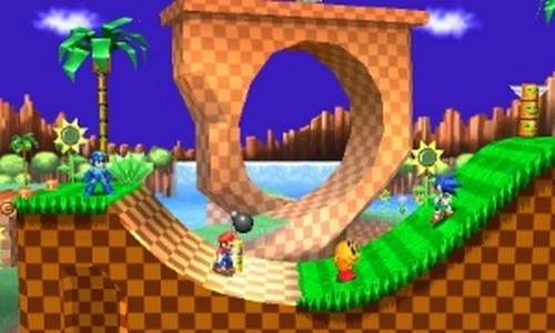 | [/td]Vous combattez sur une partie de la piste Green Hill. Elle se compose d'une surface principale de terre et d'un pont. Le sol peut s'effondrer et créer un petit gouffre. Vous pouvez parfois apercevoir des personnages emblématiques de la série Sonic passer en arrière-plan. Il arrive également que des "Points de passage" sortent du sol, ces derniers peuvent vous servir à frapper les adversaires. | |