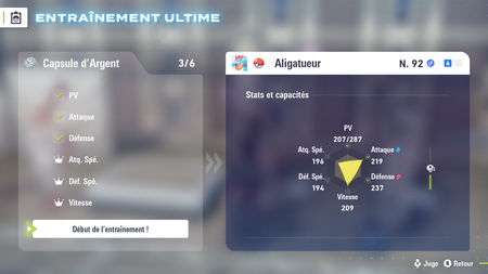 L'Entraînement Ultime est certes pratique, mais où obtenir des Capsules ? Malheureusement, la seule source répétable de Capsules est aléatoire. Il s'agit des matchs du Royale Z-A ∞. Après chaque victoire au match final, vous avez 6.90 % de chances d'obtenir 3 Capsules d'Argent et 3.45 % de chances d'obtenir une Capsule d'Or, soit 10.35 % de chances d'avoir une Capsule en récompense, ce qui est faible au vu du temps qu'il faut consacrer pour obtenir le ticket Défi. Et ne pensez pas à relancer la partie si vous n'obtenez pas de Capsule, les récompenses sont déterminées à l'avance ! En résumé, il faudra vous armer de patience si vous voulez absolument avoir des IV parfaits...Les natures