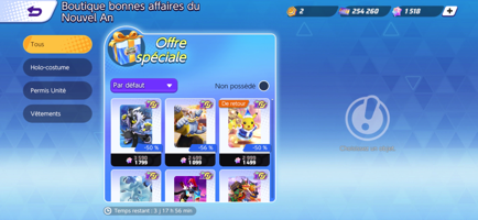 Lors de certaines occasions, des offres pour des Permis Unité, des Holo-Costumes, des pièces de personnalisation pour votre avatar ou encore des objets utiles peuvent apparaître dans la boutique. Ces offres peuvent concerner des éléments à des prix réduits ou qui ne figurent pas en boutique en temps normal.Boutique bonnes affaires du Nouvel An (Du 23/01/2026 au 26/02/2026)