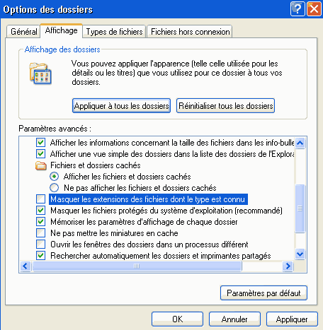 Microsoft, dans le but de rendre les utilisateurs plus ignorants, a rendu l'affichage des extensions des fichiers (par exemple un fichier bloc notes nommé "texte" a pour vrai nom "texte.txt")... Et ca pose souvent problème lorsqu'on a besoin d'inventer une extension ou lorsqu'on a un type de fichier avec une icône inconnue (reconnaître "setup.exe" parmi 3 ou 4 fichiers "setup" n'est pas toujours évident). Pour afficher ces 3 lettres magiques il suffit d'ouvrir un dossier, de cliquer en haut sur "outils" puis "options des dossiers" puis l'onglet "affichage" et de décocher la case "masquer les extensions des fichiers dont le type est connu".